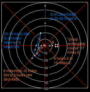 The direction of subsequent movement is described by Perkins as NNE and by BOI-485 as NW. Here BOI-485 is untrustworthy because, as has often been pointed out, a direction NW from a position SW is a heading away from the station, not "into the station", and could not possibly bring the target to a position "two miles NW of station". One suspects clerical confusion of reported position with reported heading. Perkins' first-hand account, however, is geometrically consistent: "As we watched the stationary target started moving at a speed of 400 to 600 mph in a North Northeast direction until it reached a point about 20 miles North Northwest of Lakenheath." It is reasonable to suppose that sloppy transcription from the original reports into BOI-485 has rendered "20 miles" as "2 miles" (which would again have been inside the CPS-5 minimum range) and confused the headings. But it seems evident despite this confusion that both sources are referring to the same movement of the same target which, broadly speaking, headed north past the airfield and stationed itself again at a position some miles to the northwest. "There was no slow start or build-up to this speed," emphasises Perkins, "it was constant from the second it started to move until it stopped."